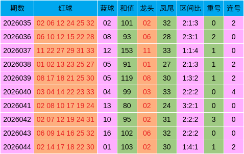 双色球2026044期开奖,本期奖号:红球02、14、17、18、22、30亚星龙虎斗,蓝球01。 足球皇冠手机投注网址www.viphuangguantiyuaccess.vip皇冠博彩 当期红球号码大小比为4:2,三区比为1:4:1,奇偶比为1:5,龙头开出02,凤尾开出30,开出1枚重号14,开出1组连号17,18。蓝球开特等数号码01。 近10期抽象特征图(双色球第2026045期三分区认知) 皇冠客服飞机:@seo3687亚星龙虎斗